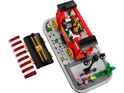 The popcorn wagon is a nostalgic and playful model, inspired by colorful carts found in amusement parks. It features a beautifully decorated exterior with a removable roof and canopy to reveal intricate interior details. Turn the golden knob to make the popcorn pop, open the sliding glass door to serve customers, and remove the steam engine for maintenance—a real working engine built over 100 years ago. The wagon sits on a display stand with a cobblestone road, pavement, lamp, and bright flowers, attracting a curious bird and butterfly. Two minifigures are included, making it perfect for both display and imaginative play.