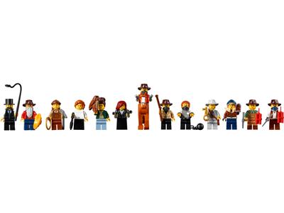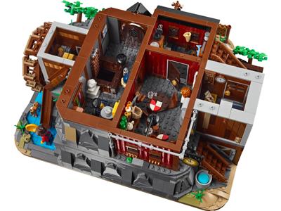 Embark on a Wild West expedition at Brick Creek to discover gold nuggets and precious stones! Grab a pickaxe and start digging, but watch out for lurking bandits. The set is divided into four layers: the ground floor includes a mine with food storage, minecart rails, a working dynamite mechanism, a stamp mill, and a water-powered rock crusher, plus an outdoor area with a cascade river, water wheel, old well, wooden wagon, and ore chute. The first floor features Dr. Brickwood’s office with two hidden spots, a secret gold safe room, cantina, kitchen, and post office. The second floor has a casting room for molding nuggets into gold bars, a dormitory with six beds, a hallway, working winch, and balcony. The third floor includes a working wooden headframe to transport loads to any level.