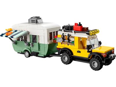 Explore deep into the forest with a family as they take their rugged SUV for an off-road adventure, biking along winding trails, casting lines into rushing streams, and relaxing in a cozy tent beneath the towering pines. The versatile 5-stud-wide SUV, designed as a companion to Camping Adventure 910041, features authentic off-road gear including tools, a rear ladder, and a mountain bicycle with a spare tire. It can also connect to the camper from the original set, continuing the story of the same family—parents, older son, and two dogs—trekking deeper into the beautiful wilderness.