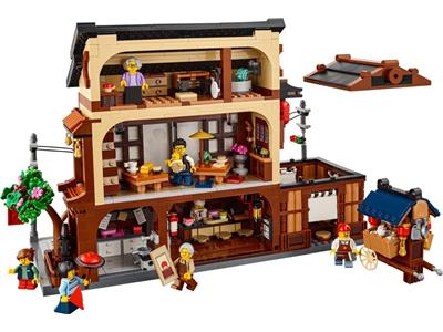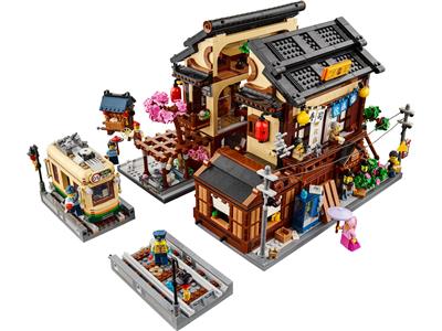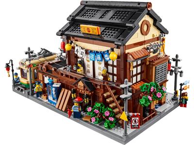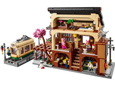 Step into the heart of LEGO City's culinary scene at the authentic Sushi Restaurant, where skilled chefs prepare traditional Japanese cuisine. This immersive set captures the charm of historic Kyoto, featuring a detailed three-story restaurant. The ground floor houses the bustling kitchen, chef's counter, and a welcoming entry area, while the first floor offers a serene tearoom for ceremonies. The top floor is a cozy living space complete with traditional furnishings. Outside, a vintage tram travels along its track, passing a lively street food stall and a tranquil Japanese garden with a koi pond, bamboo, and cherry blossoms. The scene is brought to life with 14 minifigures, including restaurant owners, chefs, customers, and a tram operator, all contributing to the vibrant daily life of this detailed slice of Japan.