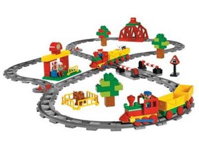 Construct two trains and a station with operational crossing gates, trees, and assorted trainscape accessories. This set comes with three play figures and 42 diverse track pieces, enabling a full layout that can extend up to 6 feet by 3 feet. The included tub with a secure lid ensures easy cleanup and storage. It is fully compatible with all LEGO Duplo train sets and the broader LEGO Duplo system.