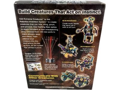 Introducing Extreme Creatures for the Robotics Invention System—build creatures with the power to bite, sting, pinch, and pounce. Equip them with flashing fiber optics to alarm intruders or lure in prey. With 149 new parts, craft pincers, jaws, and claws, then release your creation into the wild to hunt—or be hunted. Take on 12 CD-ROM challenges with guidance from the Extreme Creatures Constructopedia, and use fiber optics to attract or intimidate other creatures.